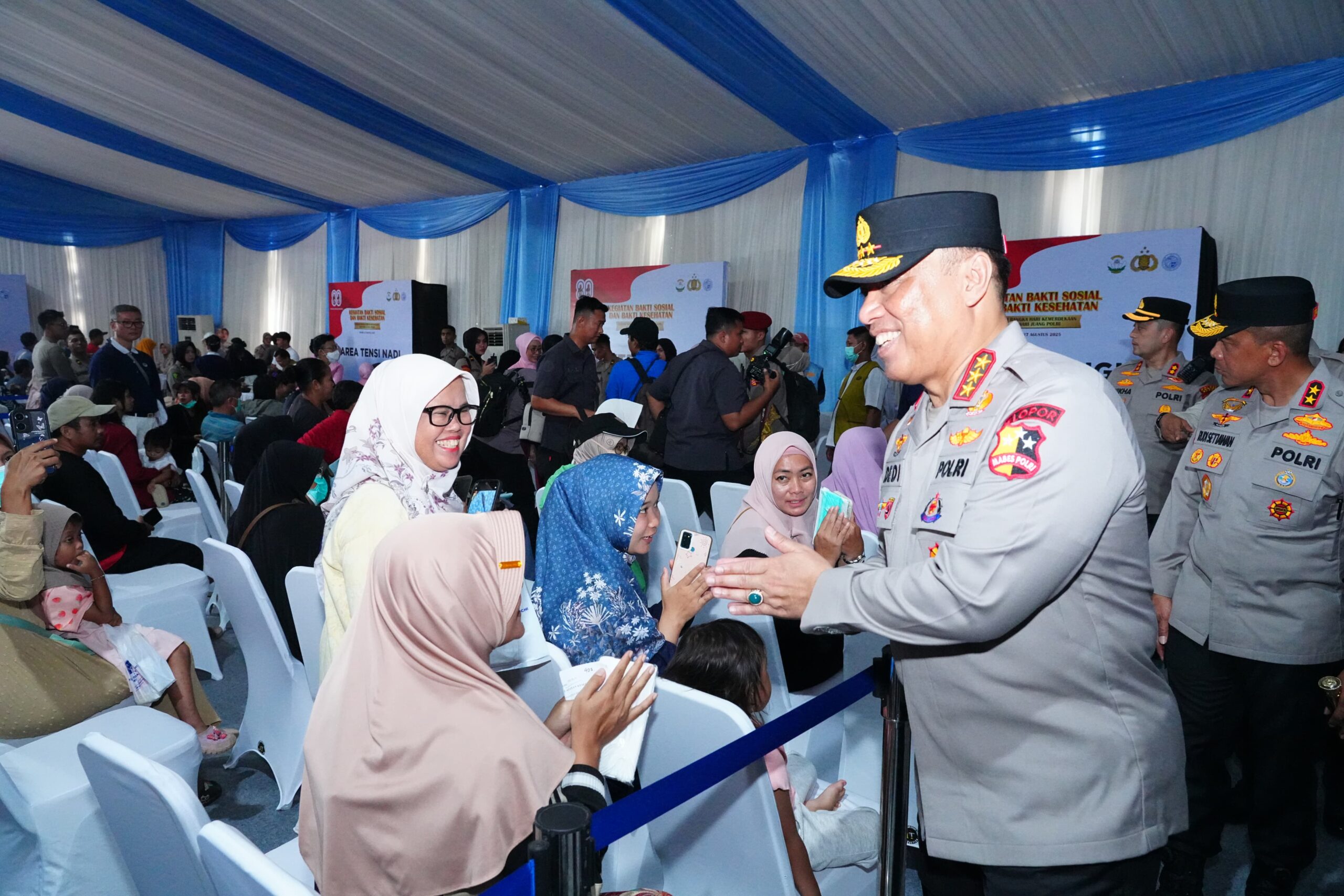 Dengan penuh semangat, Wakapolri menyambut warga yang antusias untuk mendapatkan layanan kesehatan gratis dan paket bantuan sosial. Beliau berjabat tangan, bercakap-cakap, dan bercengkerama serta harapan masyarakat setempat, menunjukkan komitmen Polri untuk hadir di tengah masyarakat.